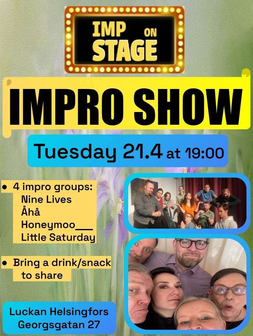 Come to see the impro groups Nine Lives, Åhå, Honeymoo and Little Saturday! They will make the unexpected happen on stage and will create characters on the spot and twist them into a storyline that not even the improvisers know where it's going.